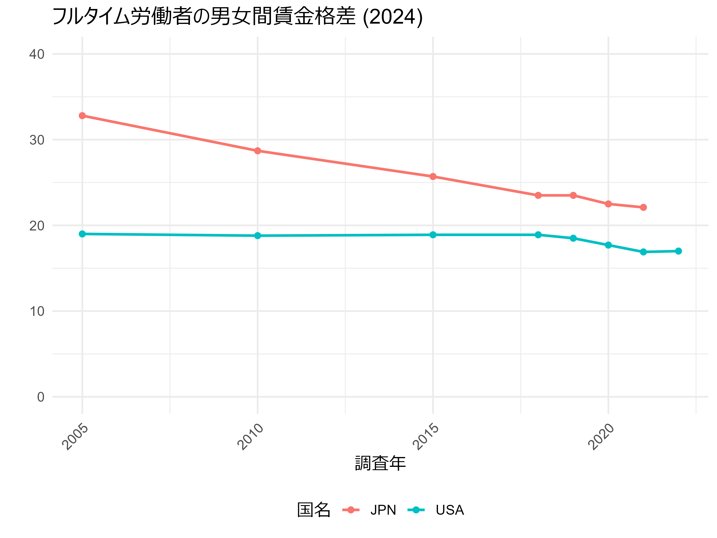 実は、日本の男女間や正規非正規間の賃金格差は、国際的に見て大きいです。例えば、アメリカと比較したフルタイム労働者の男女賃金格差は以下のようになっています。