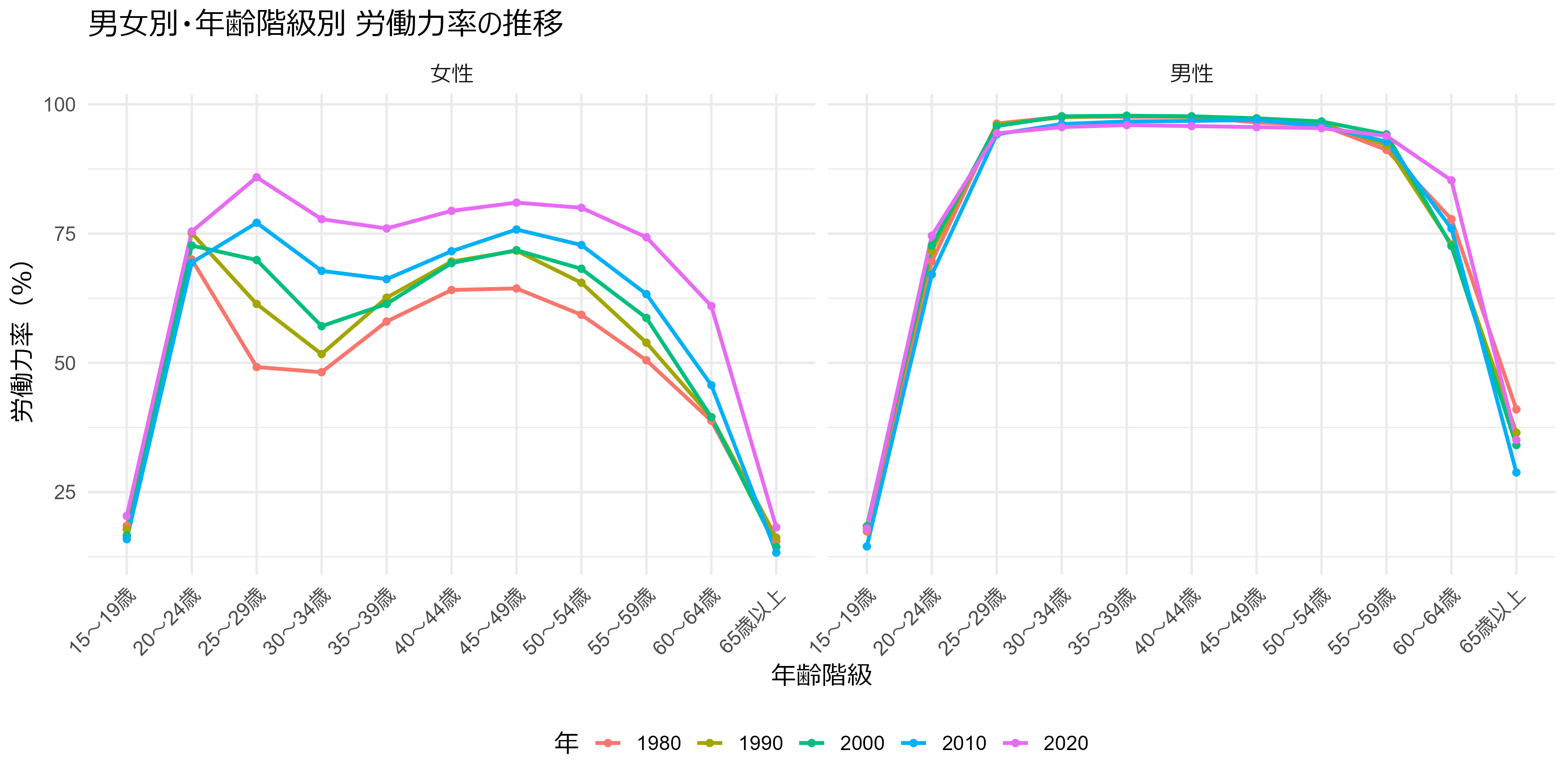 - 最近になるにつれてM字型カーブの底は浅くなっている。