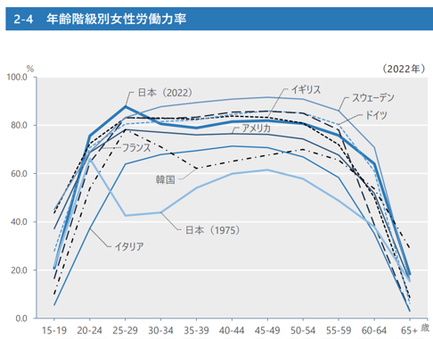 こうした労働力率のカーブの形状は、それぞれの国の育児休業制度や政府補助のある保育園の整備など、女性の就業を支援するための政策の有無によって影響を受けます。